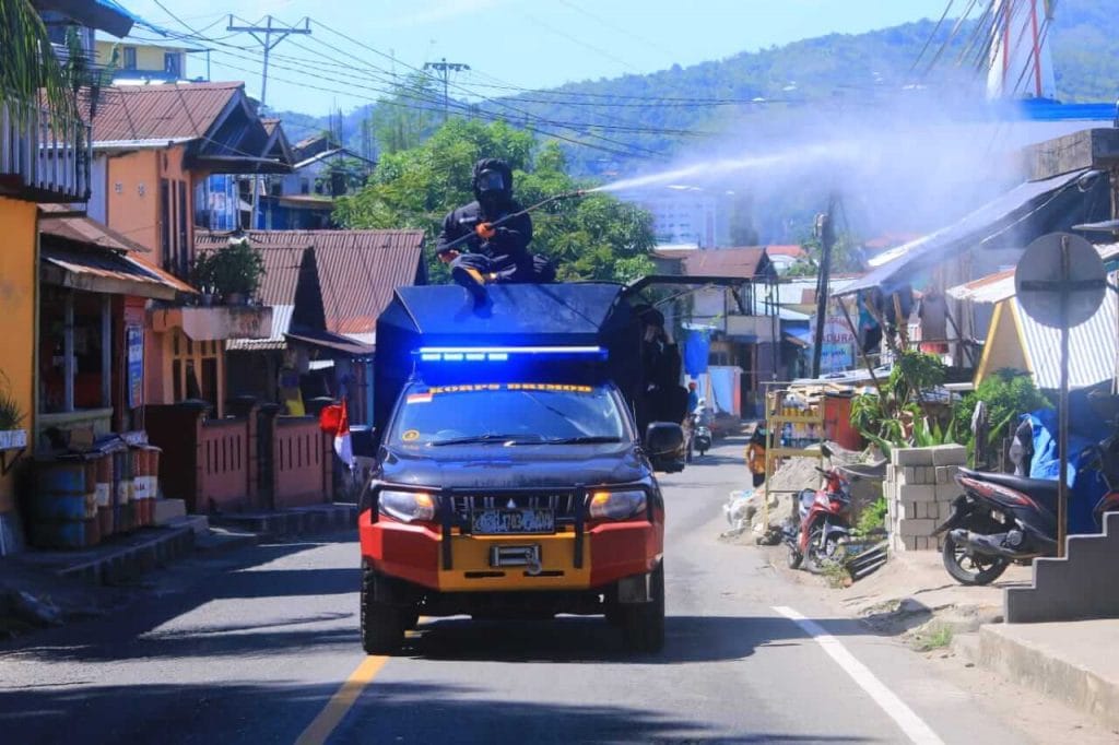 Satuan Brimob Polda Maluku mengerahkan seluruh personil dan peralatan yang dimilikinya guna melakukan penyemprotan disinfektan skala besar.