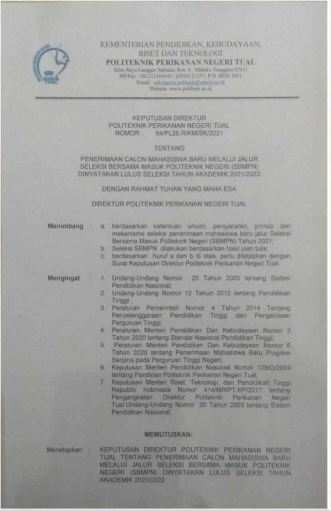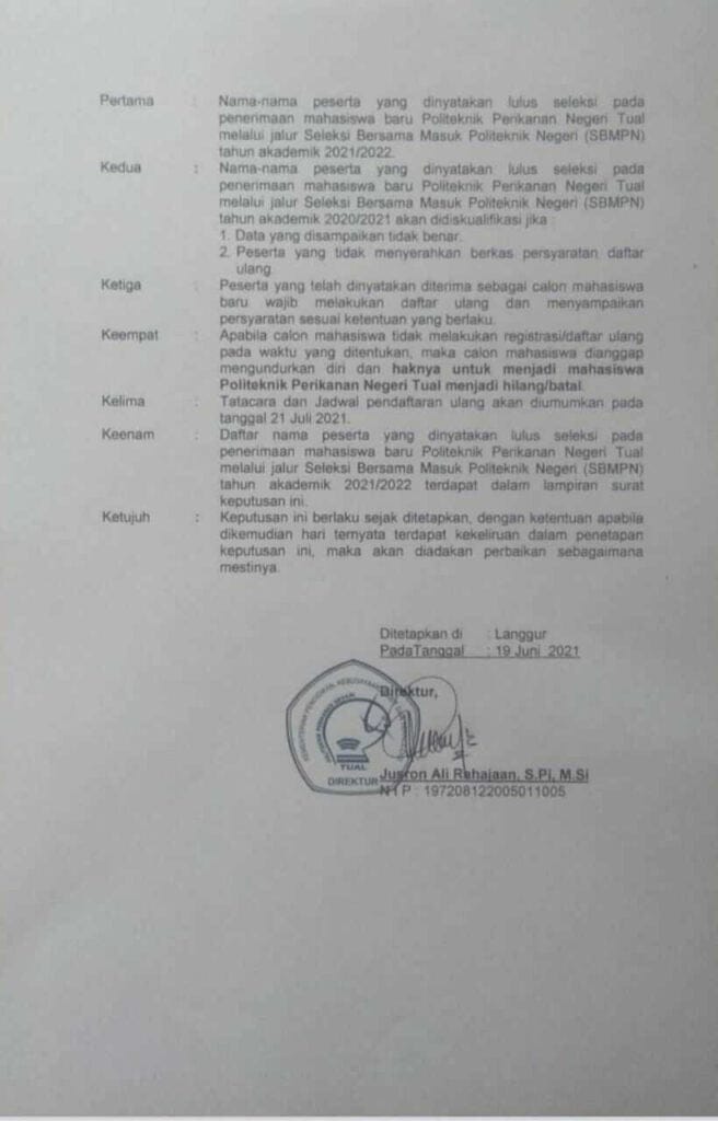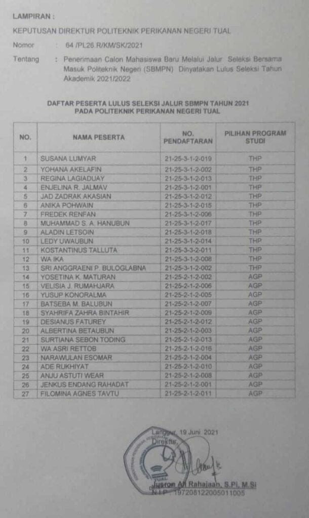 Sebanyak 27 calon mahasiswa dinyatakan lulus SBMPN 2021 lewat surat keputusan Direktur Polikant Jusron A. Rahajaan bernomor 64/PL26/R/KM/SK/2021.